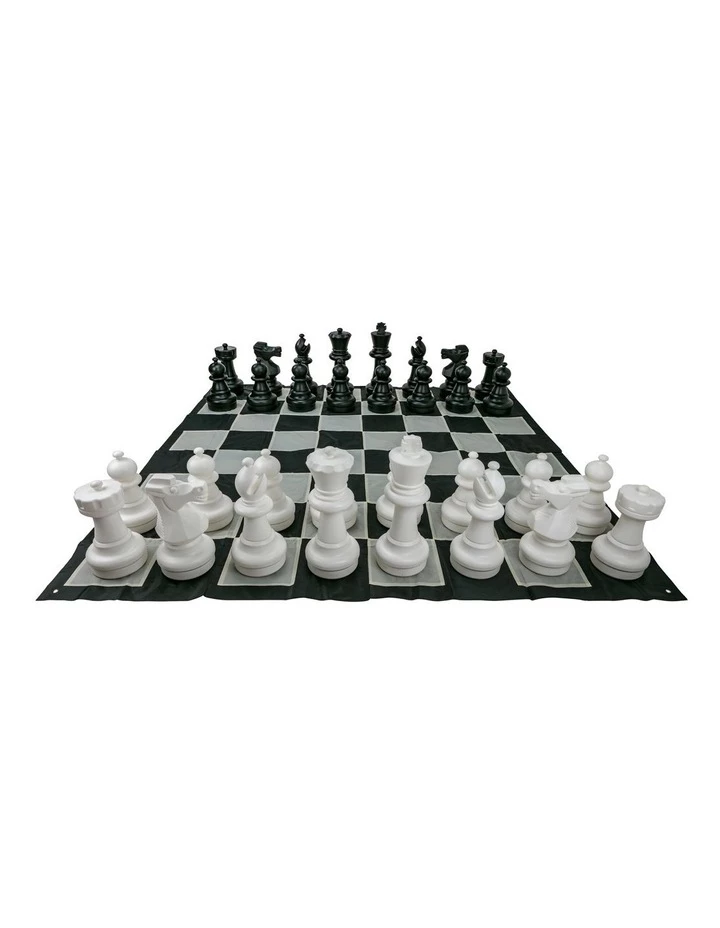 Giant Chess Specifications: 16 black Chess pieces & 16 white Chess pieces Pawn Height 40cm King Height 62cm Nylon Mat is 3x3m Total weight is 31kgs Rules Included UV protected Waterproof Pieces durable plastic construction Age: 6yrs+ Giant Chess? backyards, resorts, parks, campgrounds, hotels, sports areas, time shares, children?s hospitals, anywhere there?s a large flat surface to pla Unfortunately our courier drivers do not deliver to P.O Box addresses, so please advise of an alternative address such as an office or workplace for delivery.