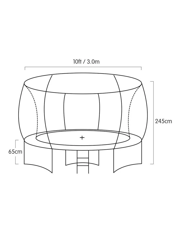 CONTENTS: * 1 x 10ft Trampoline with net * 1 x Shoe Tidy * 1 x Ladder * Carton Dimensions: * A: 125 x 30 x 15 – 21kg * B: 121 x 40 x 16 – 18kg * C: 116 x 41 x 14 – 19kg