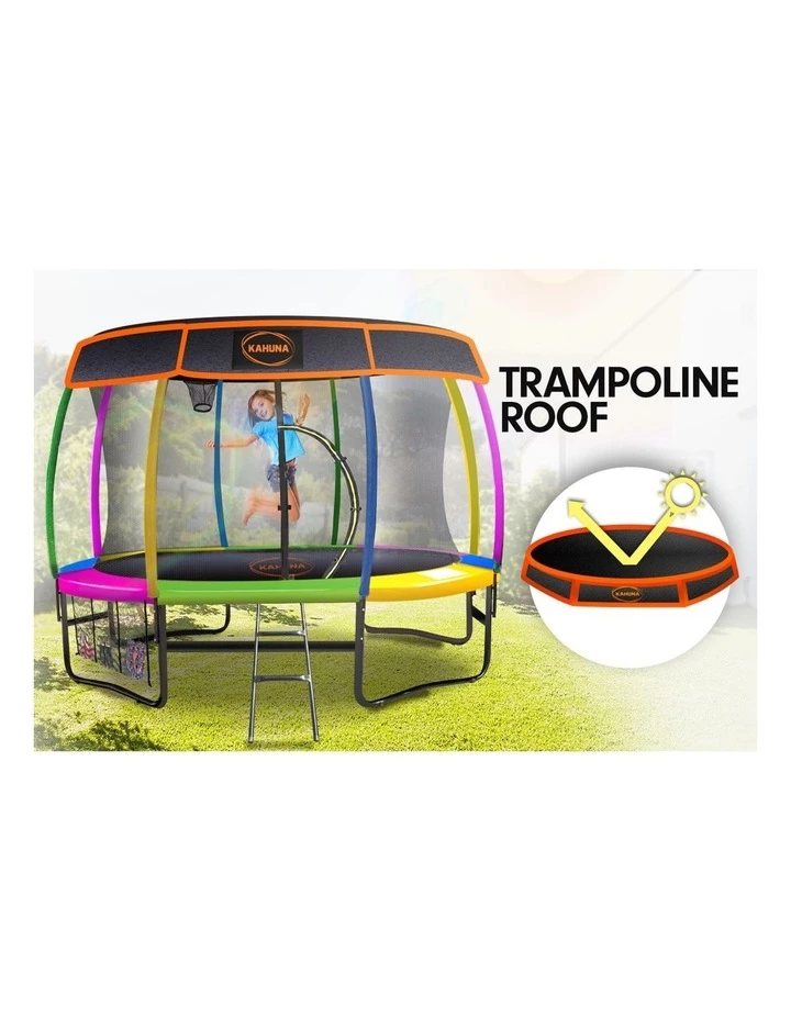 This removable trampoline roof cover allows kids to have fun under the shade. Designed to block the sun but let water through so it will not fill with rain water. Basketball Set feature cannot be used while the roof is on the trampoline.