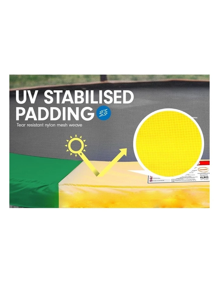 This trampoline uses linked legs for superior stability and structure of the legs also minimises the tendency for legs to dig into the ground. Legs also feature re-enforced joint bars to enhance strength and stability.The padding cover of the trampoline is UV stabilised and has embedded nylon mesh.