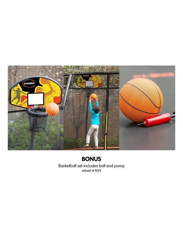 Basketball set! This trampoline is supplied with a basketball kit to add even more fun for the kids. This includes the backboard and ring, net, ball, and pump!