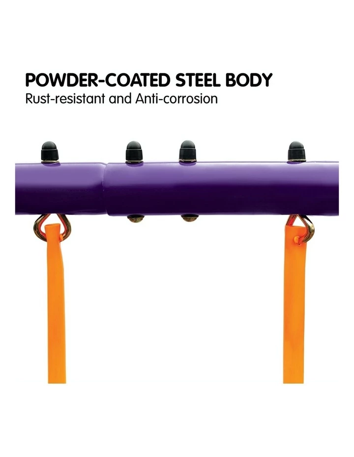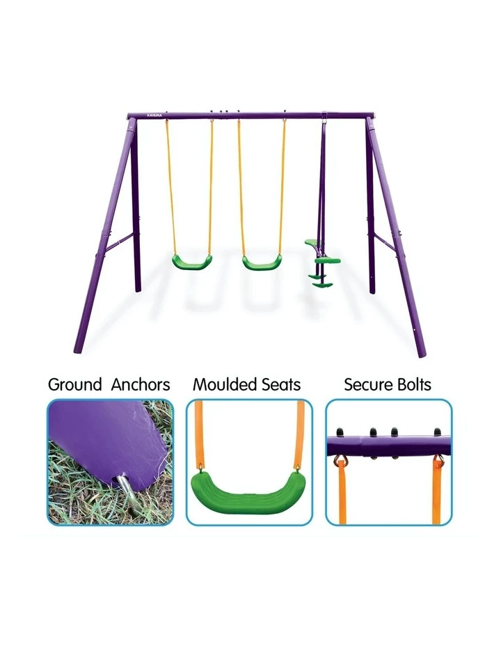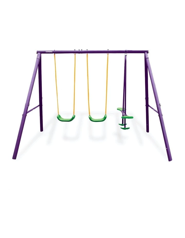 With two solo swings and a tandem glider, the Kahuna Kids Swing Set is a thrilling addition to any backyard. It has a mega sturdy frame with 4 swing seats, giving your family four times the fun!